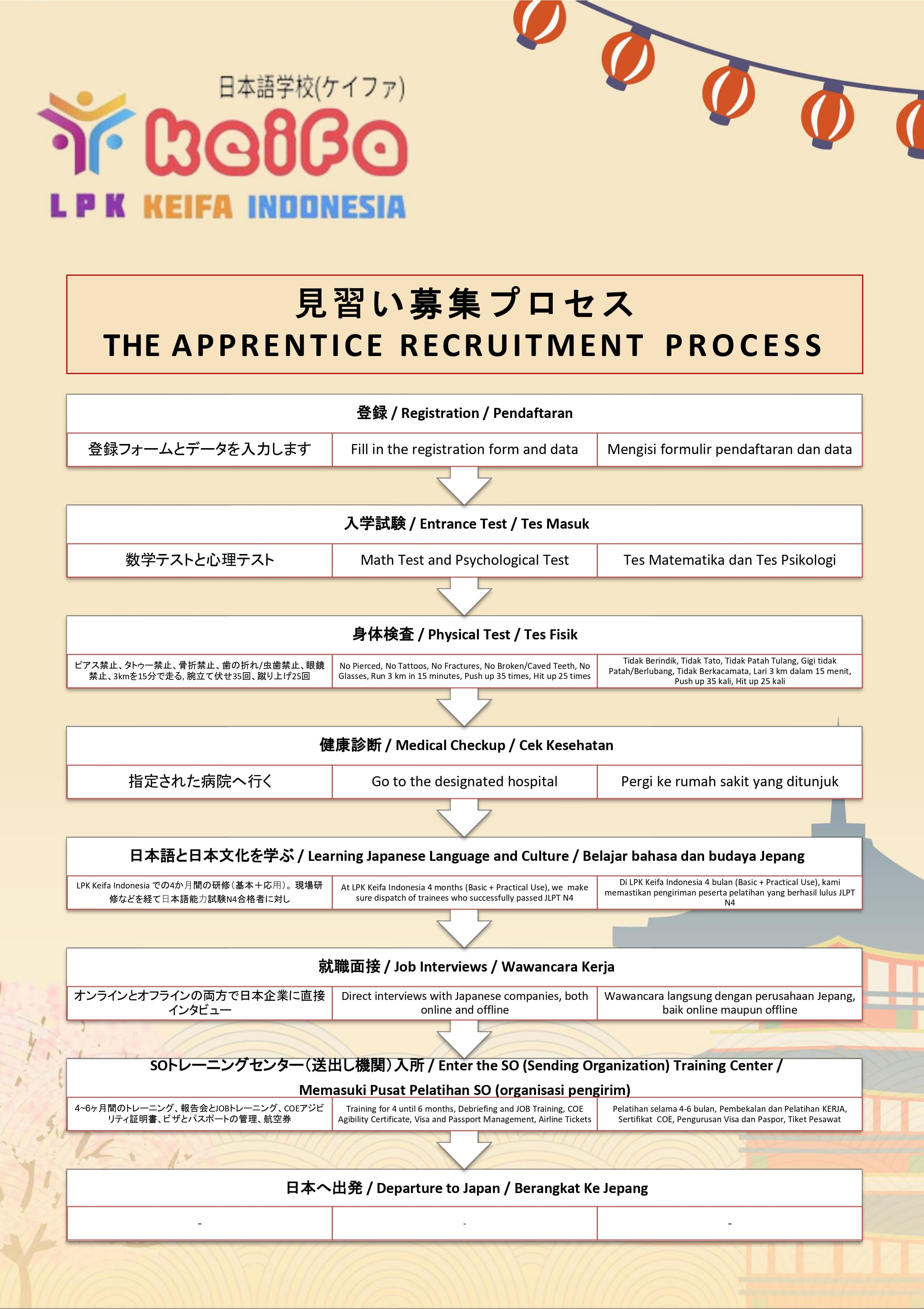 Kami LPK Keifa Indonesia memiliki prosedur yang jelas, sistematis, dan transparan untuk memastikan setiap peserta program magang dan program visa Tokutai Ginou (TG) ke Jepang mendapatkan pengalaman terbaik. Proses ini dimulai dari pendaftaran,pembelajaran,matching JOB hingga keberangkatan ke Jepang, dengan pendampingan penuh dari team dan sensei kami.